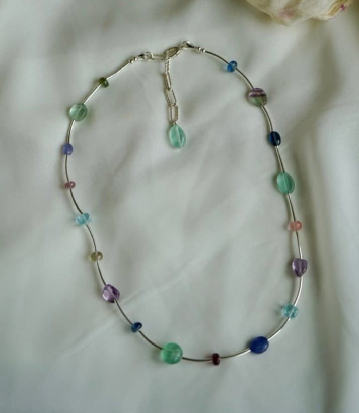 Gemstones featured are Fluorite, Blueberry Quartz, Cherry Quartz, Tanzanite, Tourmaline, Aquamarine, Amethyst & Kyanite.